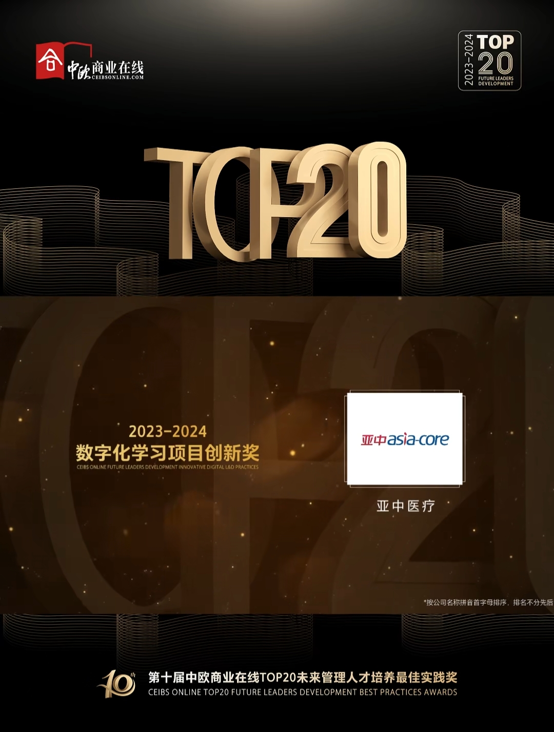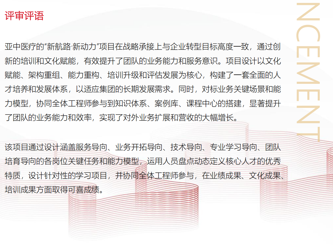 案例经过中欧历经158天的多轮评选,2024年8月16日,亚中医疗与国家能源、中国海油、安踏、vivo、快手、汇丰中国、百胜中国等各行业领先组织共同参评。荣膺“2023-2024中欧TOP20数字化学习项目创新奖”,本次获奖也是亚中第7次荣膺中欧商学院在全国范围内的优秀学习奖项。
